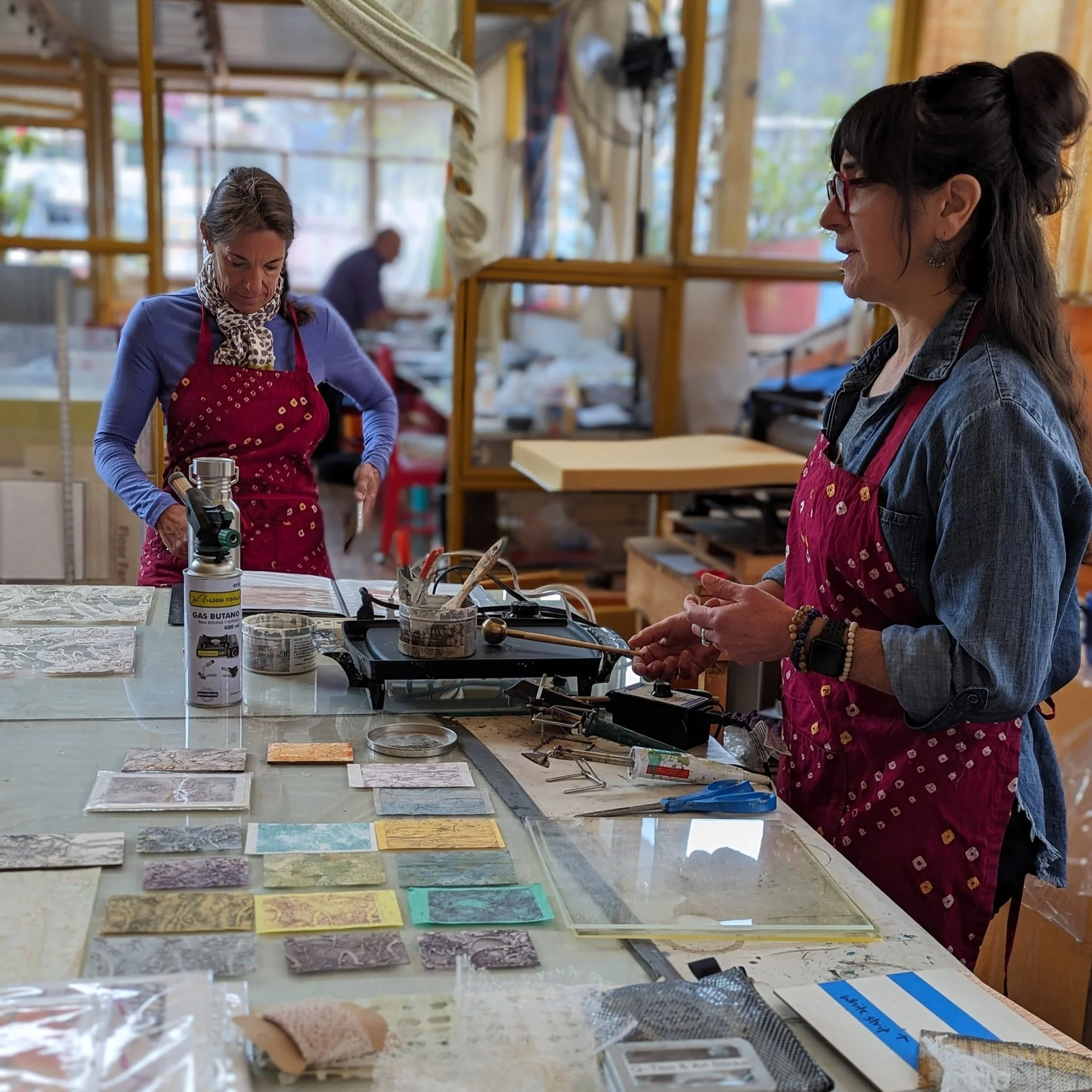 From there, Wags & Pags was born. Together they taught workshops around the country, presented their method at the SGC International and the International Encaustic Conferences, and helped shape the evolution of wax collagraph printmaking. Today, the duo continues to reunite for intimate and entertaining weekend workshops at Eliseโs waterfront studio on the Oregon Coastโstill blending their expertise, still inspiring printmakers, and still very much the dynamic duo of Wags & Pags.